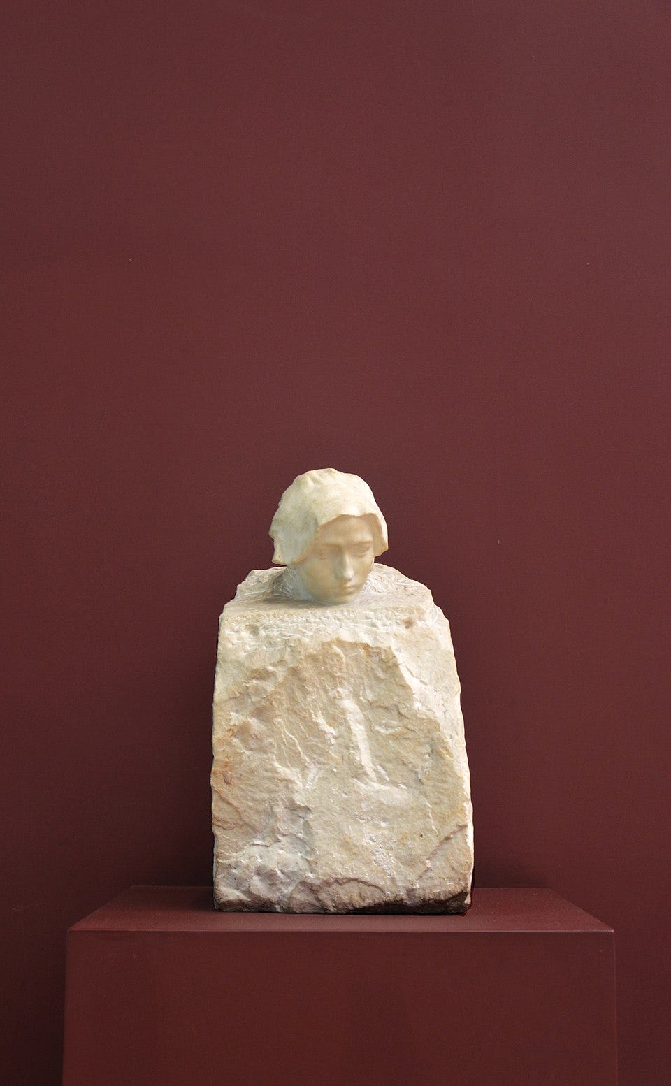 The marble figure is the work of Auguste Rodin, who at times left sculptures incomplete on purpose, using the art technique known as “non finito.” Translated from Italian, it literally means “not finished.” Detailed figures seem to emerge from roughly-hewn blocks of material, as if the sculptor stepped out for a smoke break.
