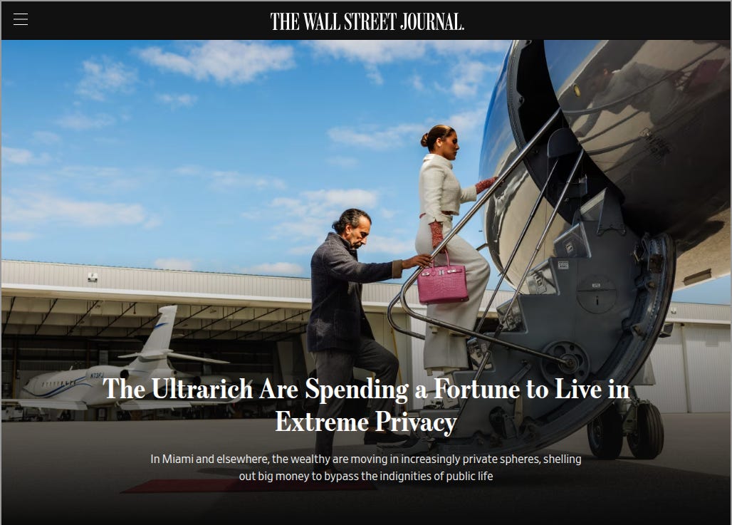 Compare that to a Wall Street Journal piece published the same week on the “ultrarich” (of which Buffett surely is a member) paying huge sums of money for extreme privacy. Private jets. Private rooms at top restaurants. Private entrances to hotels. Private garages and elevators. Exclusive clubs and schools. The epicenter of it all is not the plains of America but the beaches of Miami.